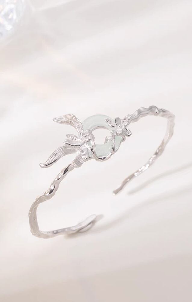 ✨️蘭の花が翡翠(人工石)に絡まるようにデザインされた古典的でエスニックなブレスレット、バングルタイプです。