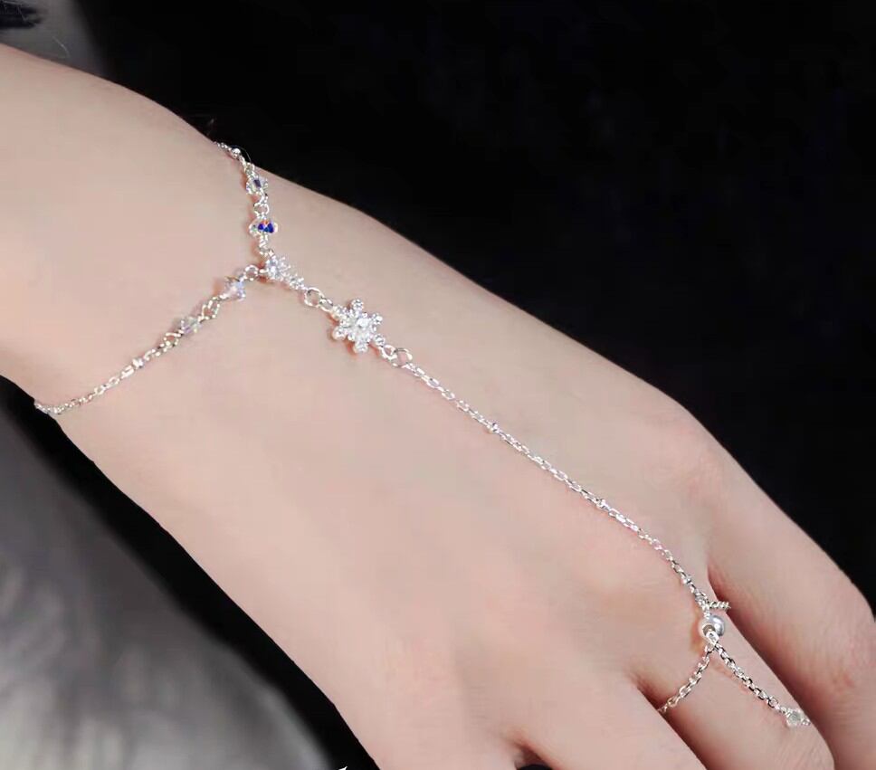 ✨️14ミリのスノーフレークをメインに、ブレスレットとリングをチェーンで一体型にしたデザインになっています。